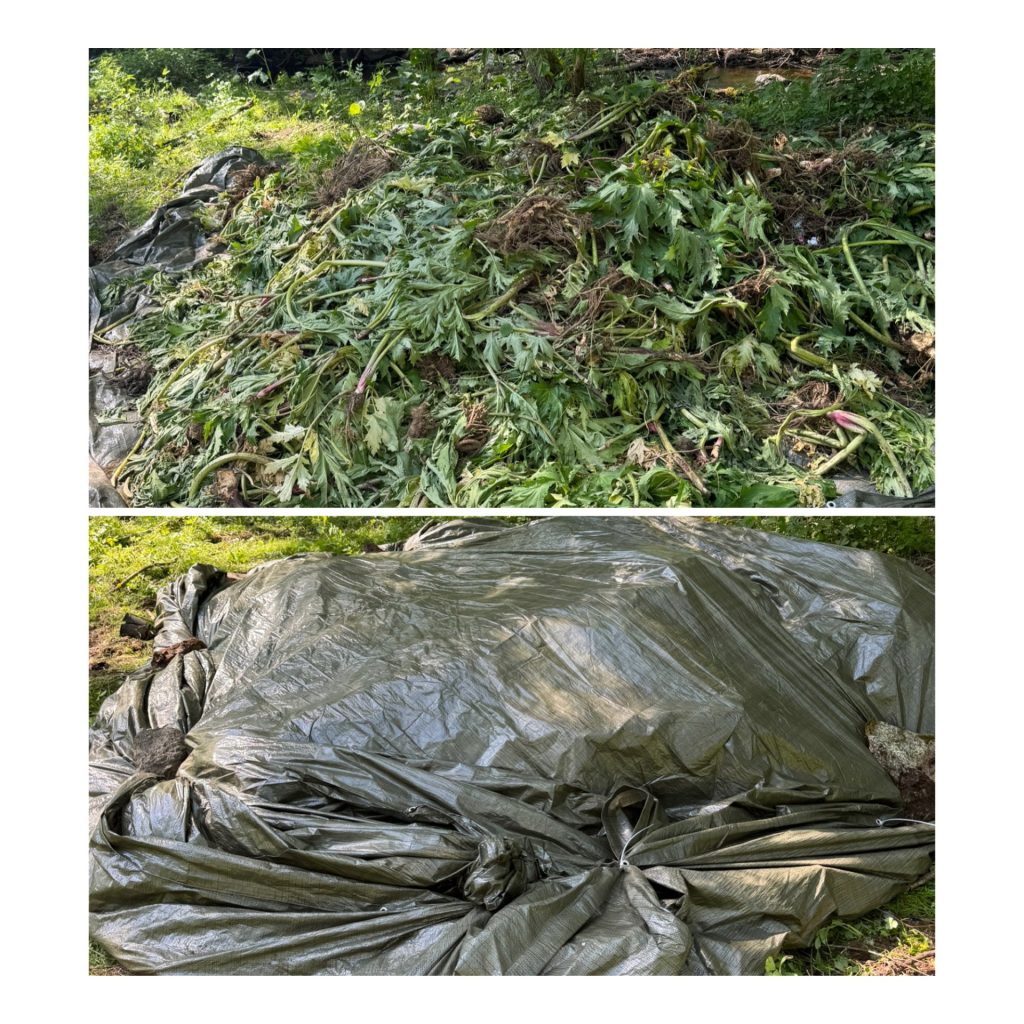 Efter uppgrävningen hanteras växtmaterialet noggrant – fröställningar samlas separat för att undvika spridning, medan övriga växtdelar placeras på täckta presenningar för att torka och dö innan bortforsling.